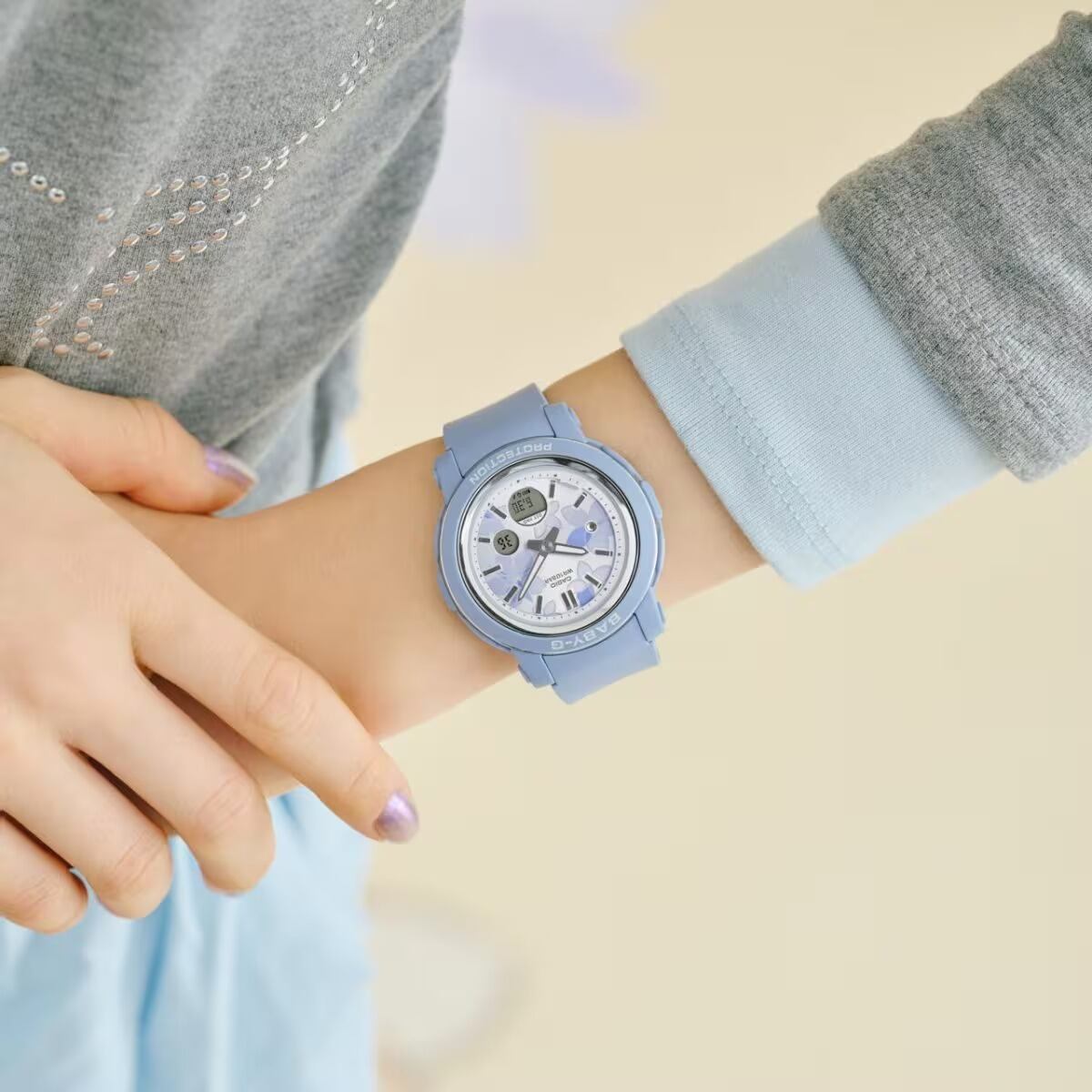 アクティブな女性に向けた耐衝撃・カジュアルウオッチBABY-Gから、フェイスに花柄をあしらったアナログウオッチです。