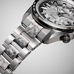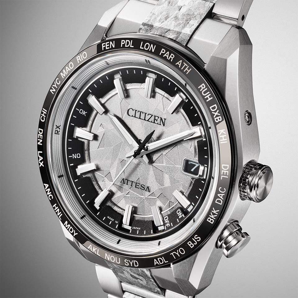 シルバーの文字板は、結晶チタニウムをイメージしたデザインで、光に反射して表情を変えるメタリック塗装をプラス。見返しリングにも同様にメタリック塗装を施すことで、文字板や外装との一体感を演出しました。