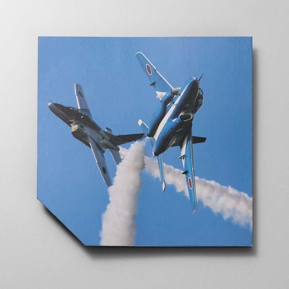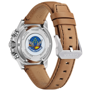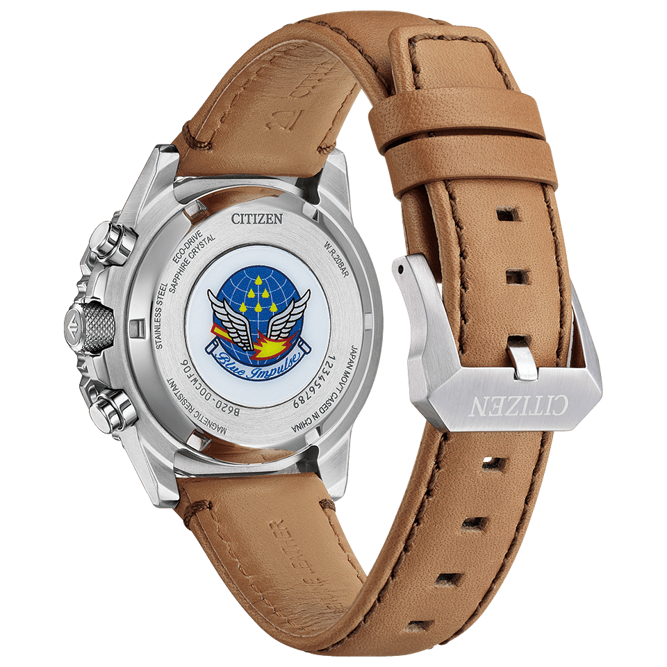 ケース径40mmのコンパクトなサイズで、腕が細い方にも違和感なくフィット。より多くのブルーインパルスファンの心をとらえる、使いやすい1本です。ブルーインパルスのチームカラーを想起させるブルーとシルバーの配色が、力強さと爽やかさを感じさせます。文字板と裏ぶたに、ブルーインパルスのエンブレムをレイアウト。専用ボックスの中には、ブルーインパルスの現行機種T-4の飛行シーンを印刷したカードが入っています。