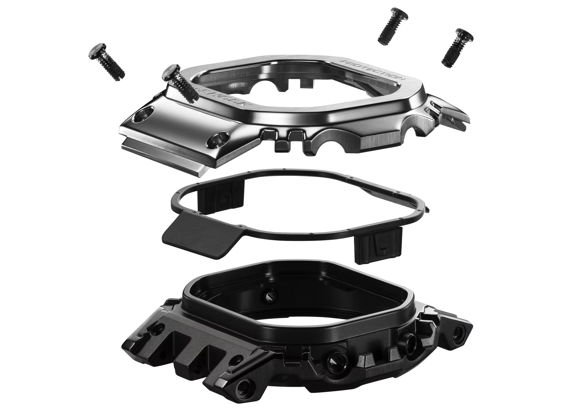 ベゼルとセンターケースを上下で連結した構造を開発。ケースサイドから見える造形が構造の美しさを強調。フルメタルながらG-SHOCKの耐衝撃基準をクリアし、気密性に優れたスクリューバックケースも採用しています。