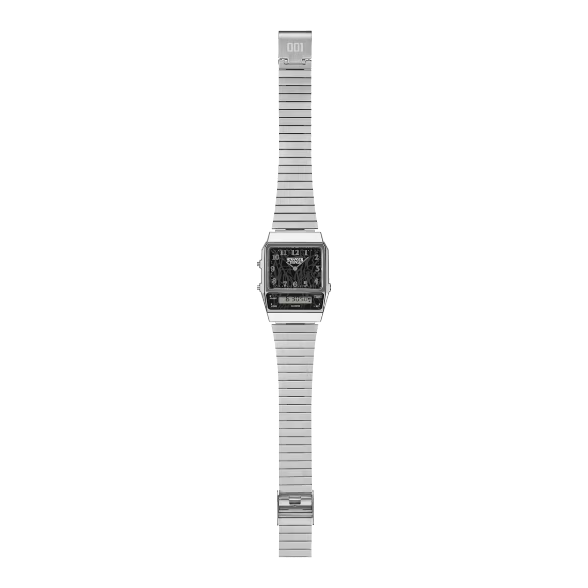 ベースモデルはAQ-800を採用。ストレンジャー・シングスを象徴する表と裏の2つの世界「UPSIDE DOWN」をテーマに、随所にその世界観を表現しています。