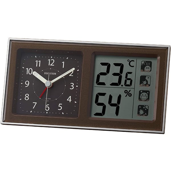 RHYTHM リズム クロック 目覚まし時計 高精度 温湿度表示付 ライト付 連続秒針 茶 ブラウン 8RE678SR06