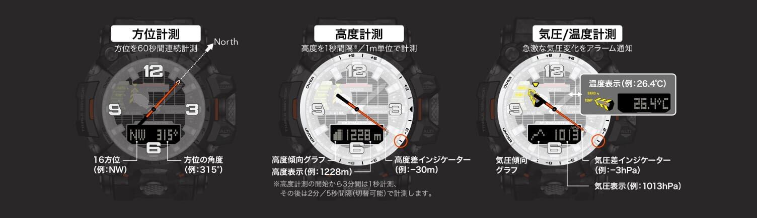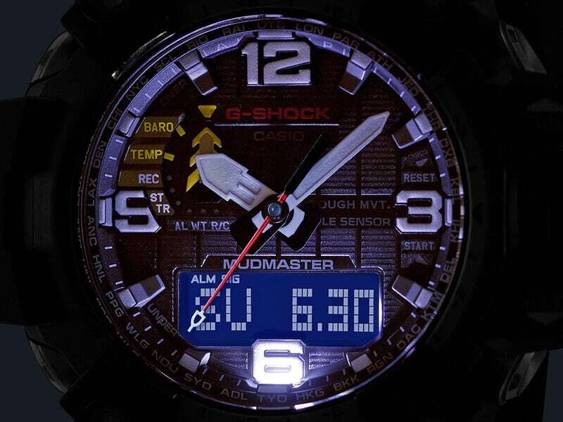 土砂や泥濘の中での任務に求められる防塵・防泥構造はそのままにダウンサイジングを行い、装着感の向上を図っています。樹脂の中にカーボン繊維を練り込み、金型で熱プレスし固めて成形したフォージドカーボンベゼルと、カーボンコアガード構造のケースにより小型化を実現。ステンレス製のボタンパイプとシリコーン製の緩衝素材を組み合わせたマッドレジストボタンにより薄型化を実現しました。機能面では電波ソーラーに加えてトリプルセンサーを搭載し、方位、気圧・高度、温度情報を取得可能。アラビア数字の大型インデックスと矢印型の極太の針を使用し、ダブルLEDライト、サファイアガラス等により高い視認性も確保しています。バンドは重機のグリップやすべり止めをイメージしたテクスチャーをつけ、ボタンには操作性を高めるローレット加工を施し、実用的で力強いデザインに仕上げました。陸上での過酷な任務に当たるプロフェッショナルをサポートするG-SHOCKです。