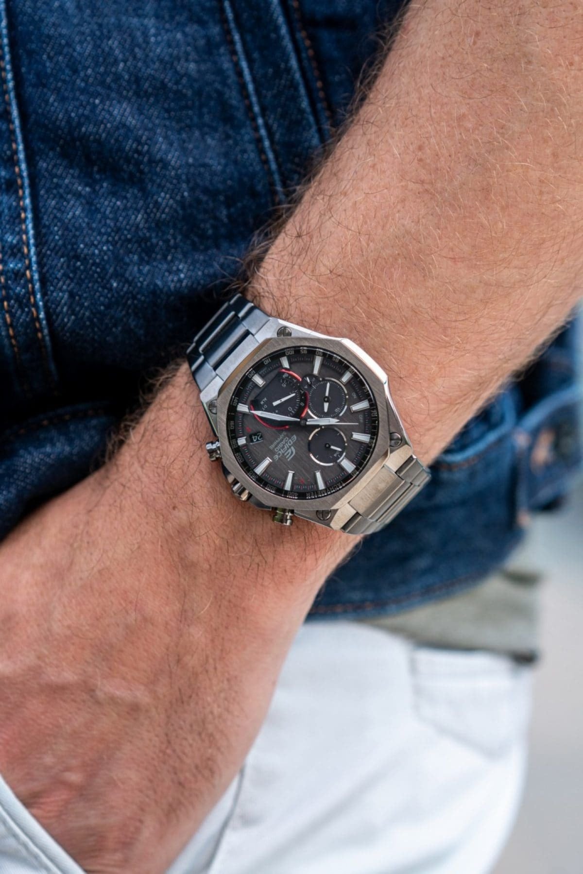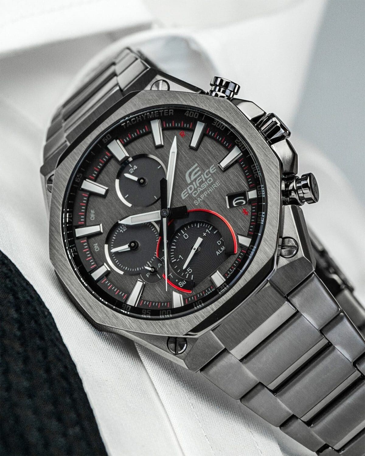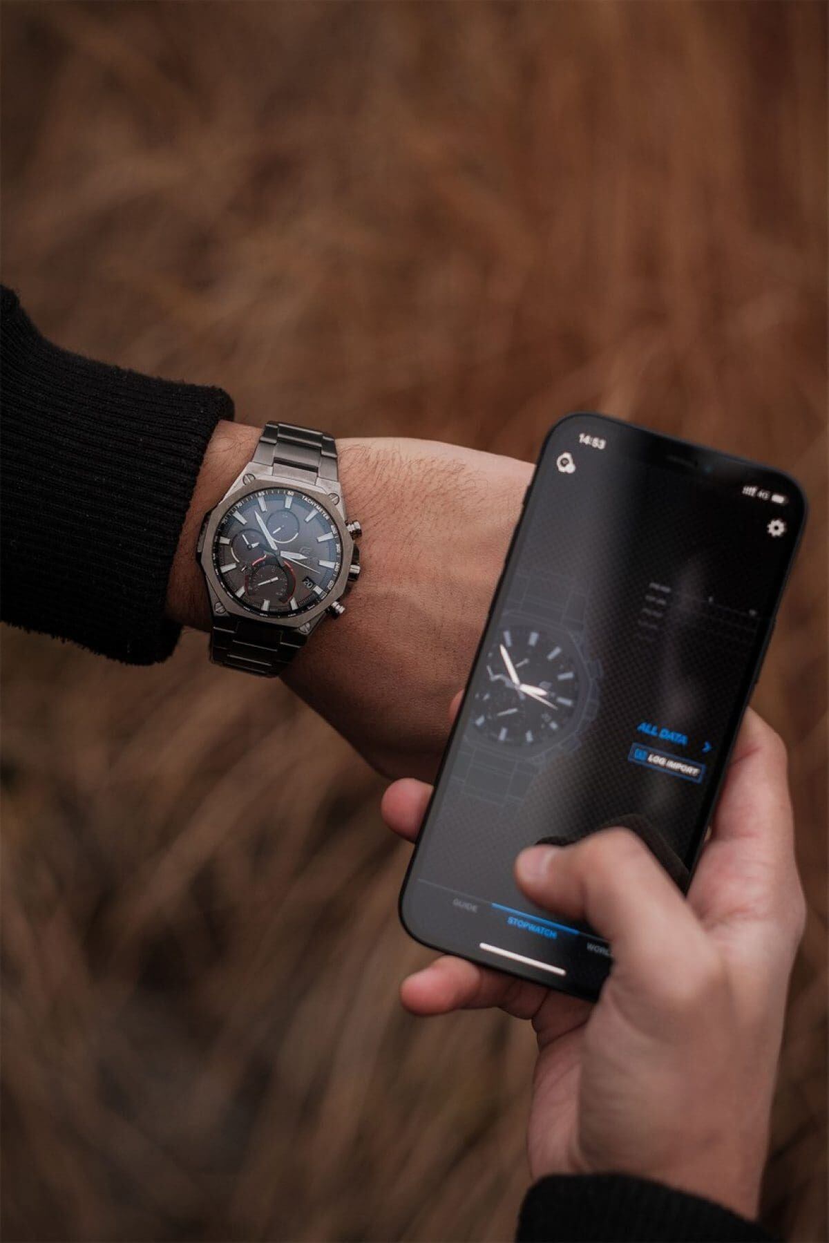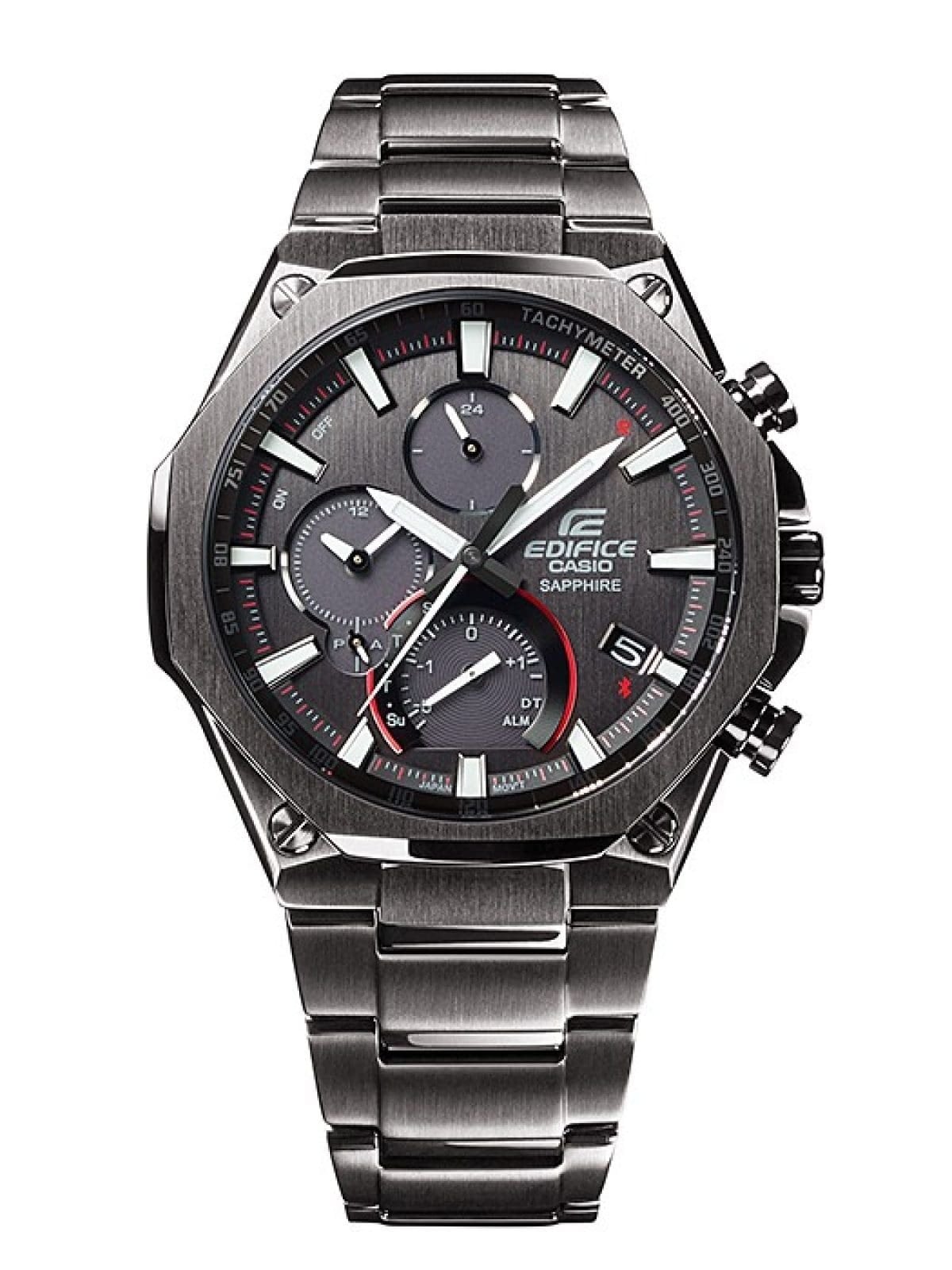 Smartphone Link | Super Slim High Spec Chronograph | Solar powered | Bluetooth®によるスマートフォンリンクと僅かな光でもソーラーチャージするタフソーラーを装備するハイスペックな多針のクロノグラフにも関わらず8.9mmという薄型ケースにより、高い機能性と装着性を両立しています。スマートフォンの専用アプリにより時計をコントロールすることで時刻補正、約300都市から選択できるワールドタイム、レース観戦時に役立つスペシャルなストップウォッチ機能などを可能にしています。風防には傷つきにくい反射防止コーティングを施したサファイアガラスを採用し高い視認性を誇ります。ケースとオクタゴンベゼルに傷つきにくくする効果のあるGray ion platedが施されスポーティでありながらラグジュアリーなデザインに仕上げました。