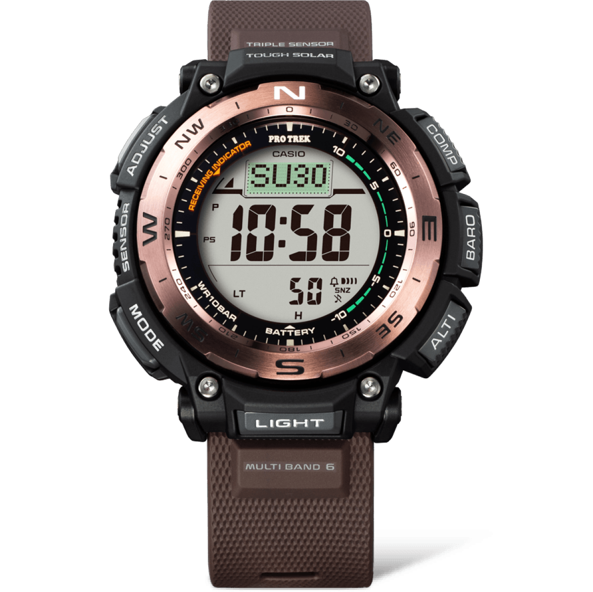 また、圧力センサーをケースの内側に搭載することで、ケースの凹凸を減らしボタンが操作しやすい形状となっています。世界6局の電波を受信するマルチバンド6やタフソーラーなど実用的な機能も兼備。