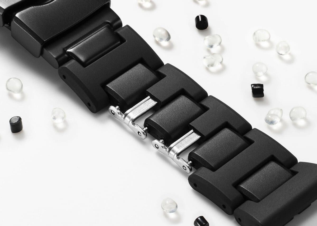 バイオマスプラスチックを使用したフィールドコンポジットバンドを採用。割れや変色などに強く、耐久性を維持しながらも軽量なバンドになっています。風防にサファイアガラス、ガラス外周にはブルー蒸着を施し、10時位置のインダイアルと合わせてクールな印象に仕上げました。ケースと樹脂製の裏蓋にもバイマスプラスチックの素材を使用しています。