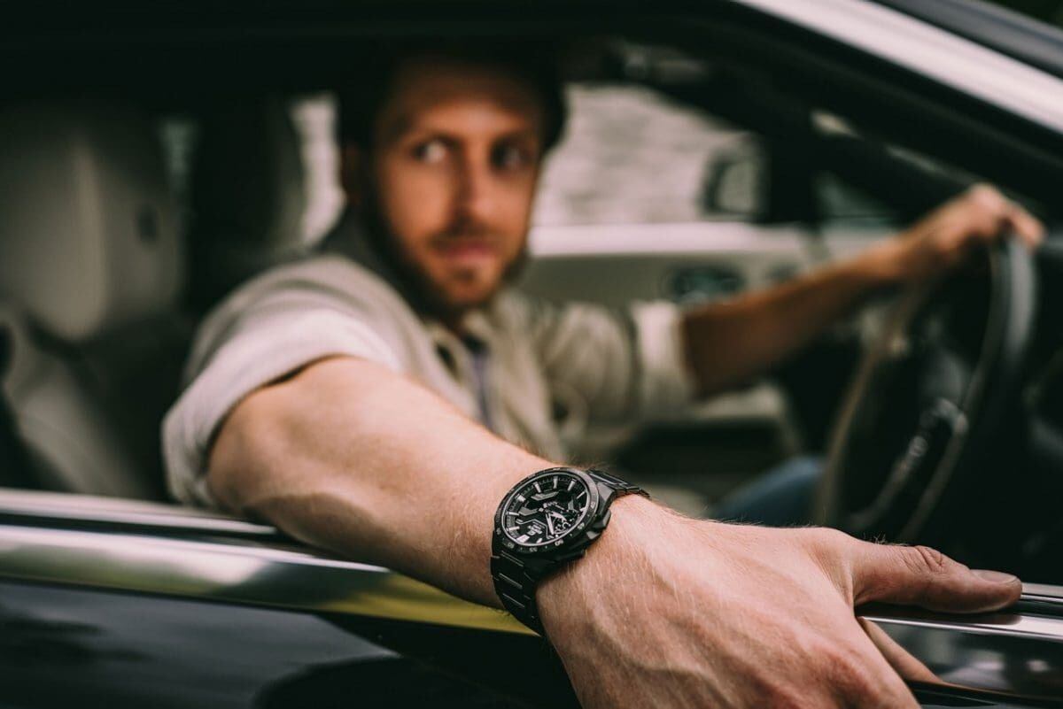 ベゼルと無垢のステンレススティールバンドにはブラックIP 処理を施し、傷つきにくい仕様となっています。