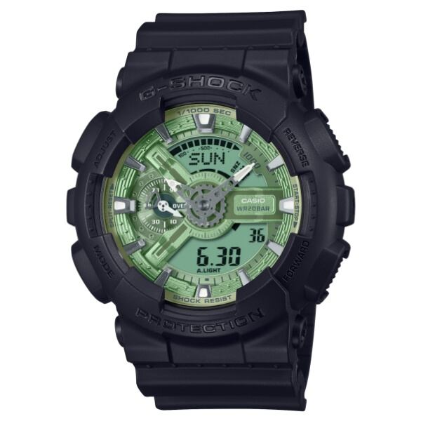 タフネスを追求し進化を続けるG-SHOCKから、存在感のあるビッグケースが人気のGA-110です。定番のブラックのバンドとベゼルを採用。立体的なフェイスデザインはセージグリーンのワントーンで統一しました。