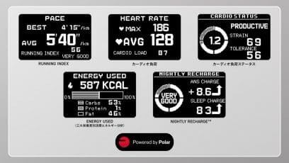 ワークアウトに役立つ機能として、心拍計測が可能な光学式センサー、歩数計測が可能な加速度センサーを搭載。ランニング、ウォーキングやワークアウトに対応しています。また、ポラール社ライブラリによるトレーニング解析・睡眠による回復度の解析、呼吸エクササイズが可能です。