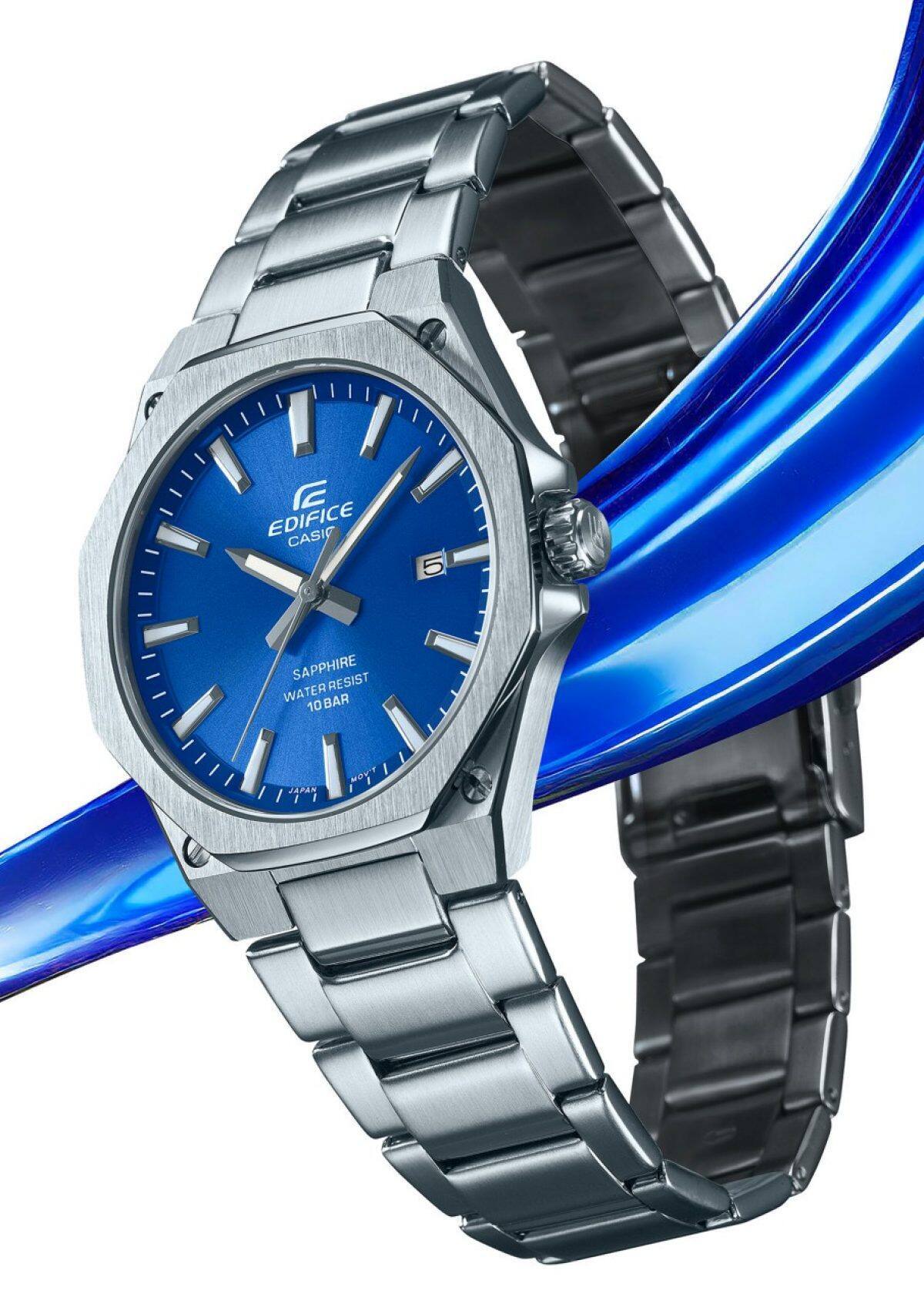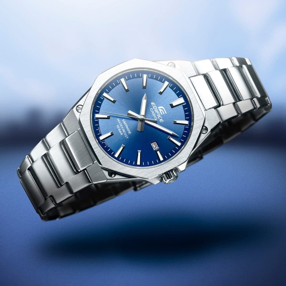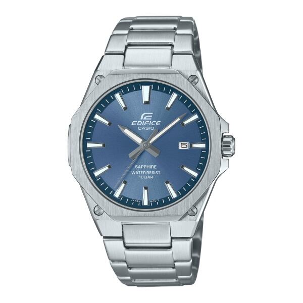 EDIFICE EFR-S108シリーズは7.8mmという薄型ケースを採用した3針アナログモデルで、装着感の良さが大きな特長です。8角形のフラットベゼルがスポーティさとラグジュアリーを両立したデザインを演出しています。