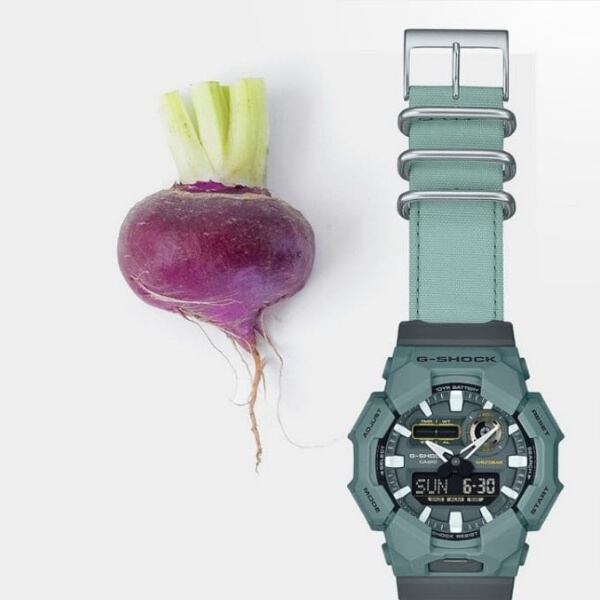 また、バンドの素材には、耐久性に優れコーデュラ糸と再生PETのリサイクル糸を使用する「CORDURA® re/cor™」を使用。着色には、「FOOD TEXTILE」の染色手法を採用し、「赤かぶ」から抽出した染料で、天然由来の優しい色合いに仕上げました。